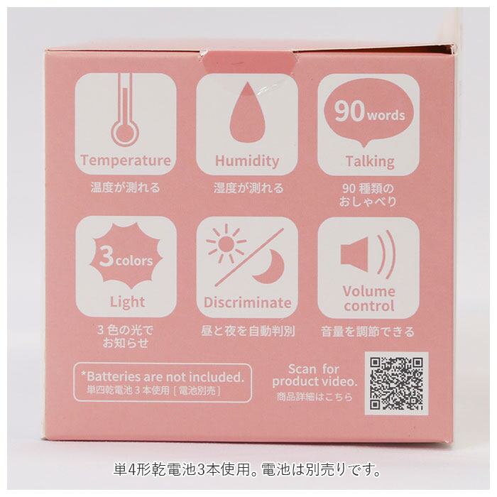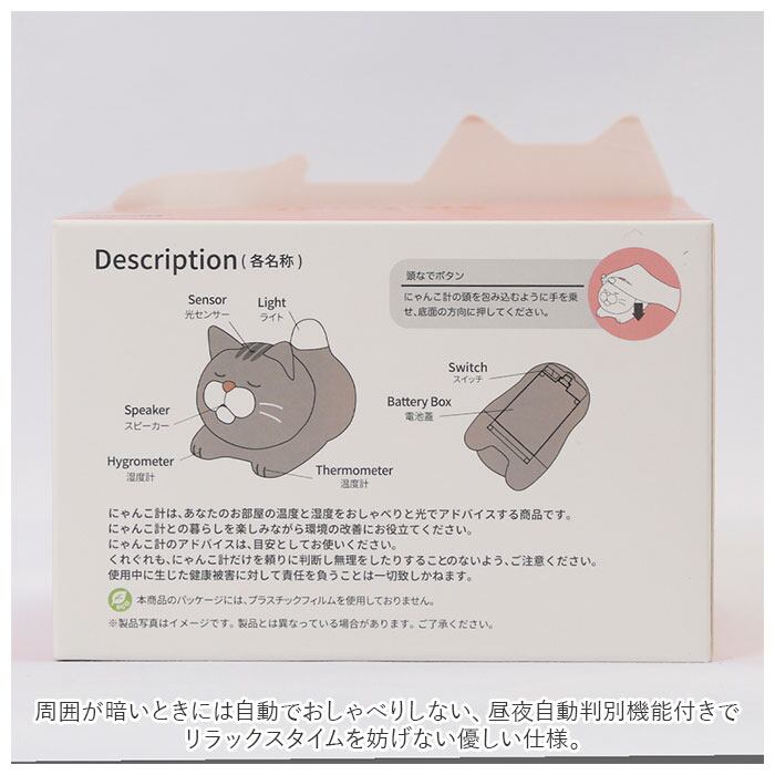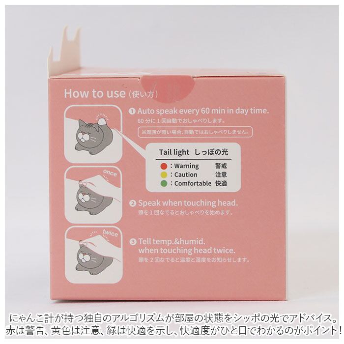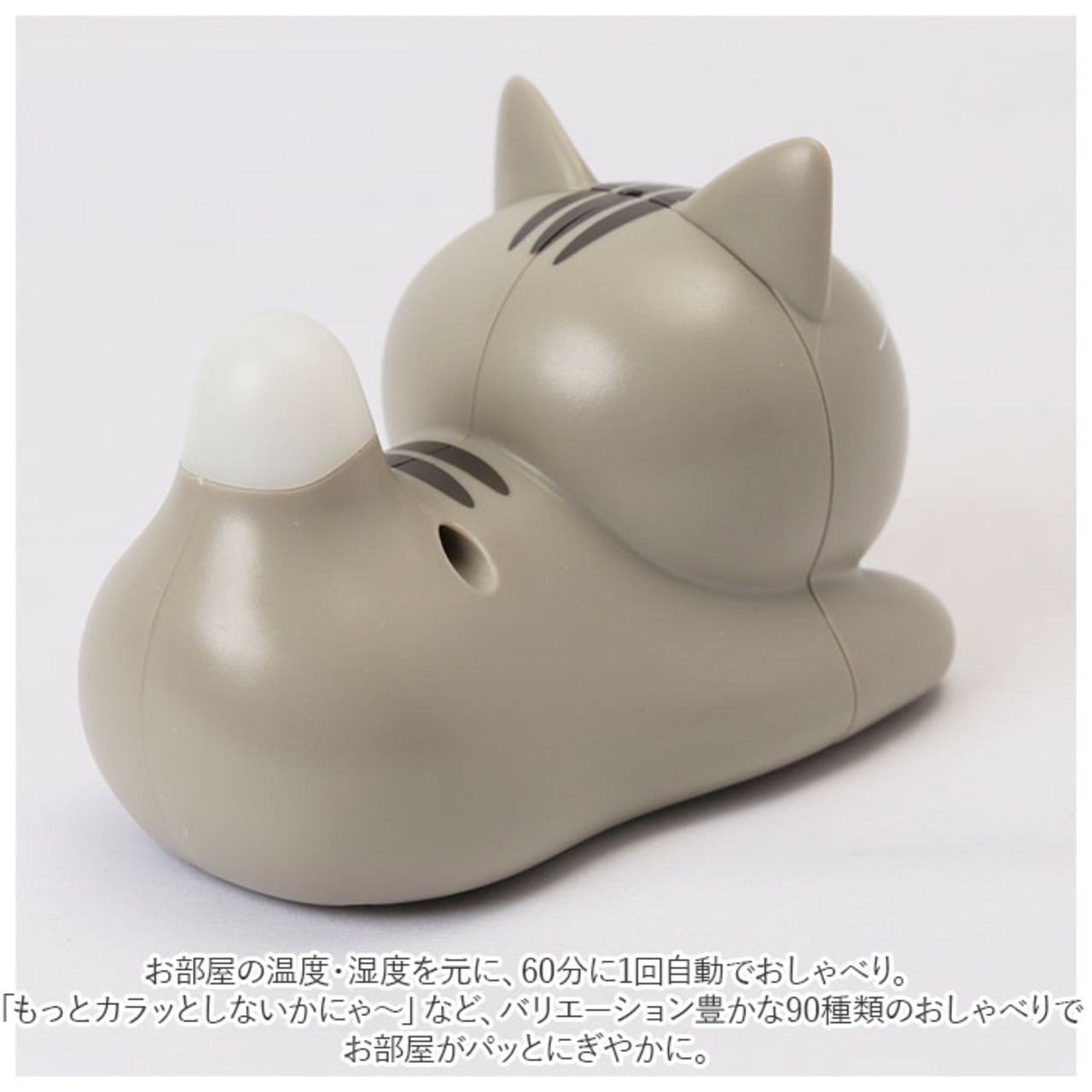 ・お部屋の温度・湿度を元に、60分に1回自動でおしゃべり。「もっとカラッとしないかにゃ~」など、バリエーション豊かな90種類のおしゃべりで、お部屋がパッとにぎやかに。