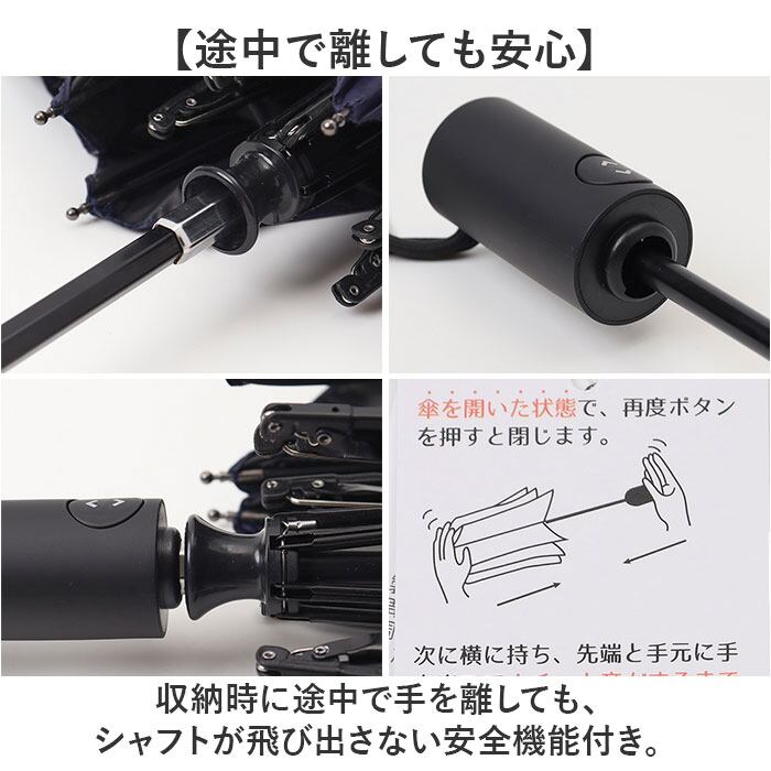 ・収納時に途中で手を離しても、シャフトが飛び出さない安全機能付き。
