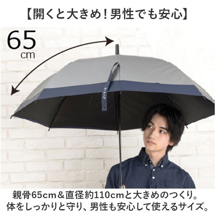・親骨65cm&直径約110cmと大きめのつくり。体をしっかりと守り、男性も安心して使えるサイズ。