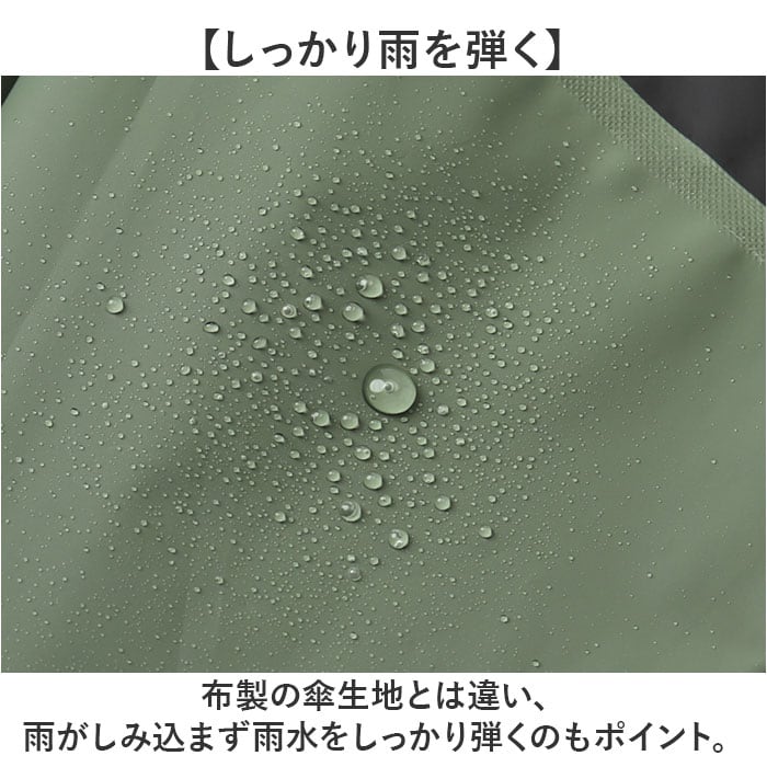 ・布製の傘生地とは違い、雨がしみ込まず雨水をしっかり弾くのもポイント。