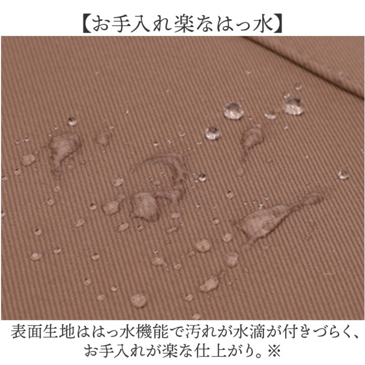 ・表面生地ははっ水機能で汚れが水滴が付きづらく、お手入れが楽な仕上がり。※