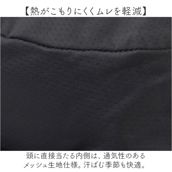 ・頭に直接当たる内側は、通気性のあるメッシュ生地仕様。汗ばむ季節も快適。