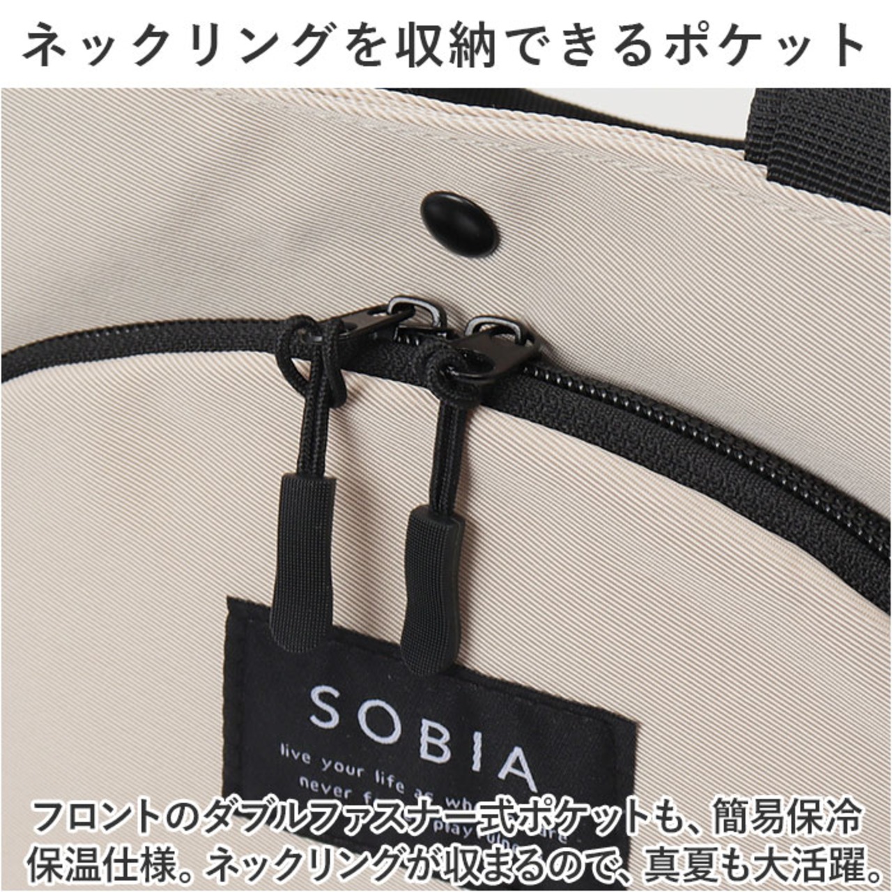 ・フロントのダブルファスナー式ポケットも、簡易保冷保温仕様。ネックリングが収まるので、真夏も大活躍。