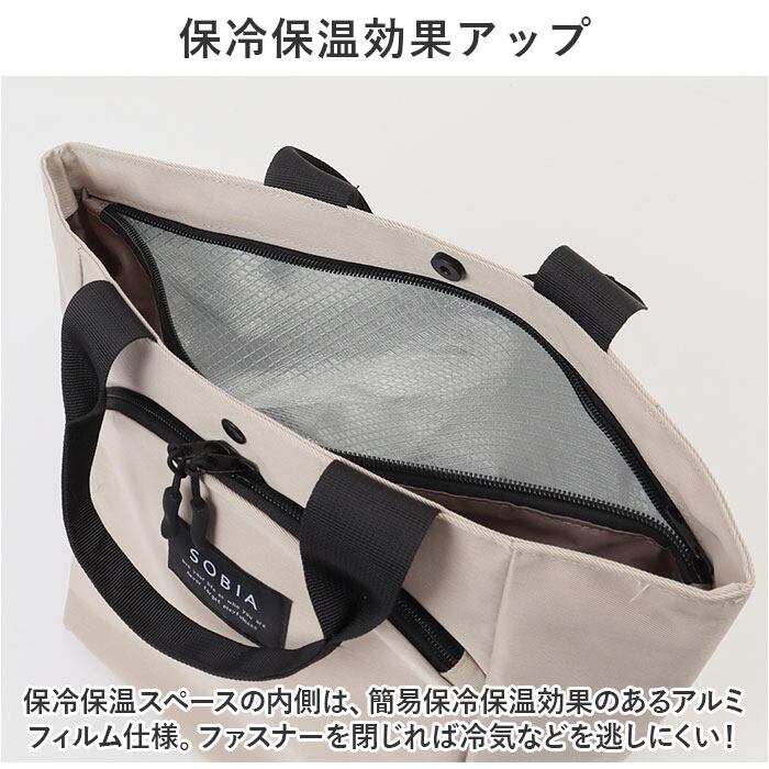 ・保冷保温スペースの内側は、簡易保冷保温効果のあるアルミフィルム仕様。ファスナーを閉じれば冷気などを逃しにくい!