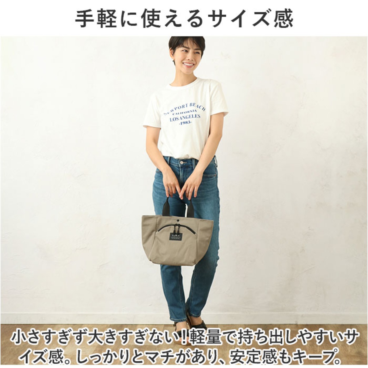 ・小さすぎず大きすぎない!軽量で持ち出しやすいサイズ感。しっかりとマチがあり、安定感もキープ。