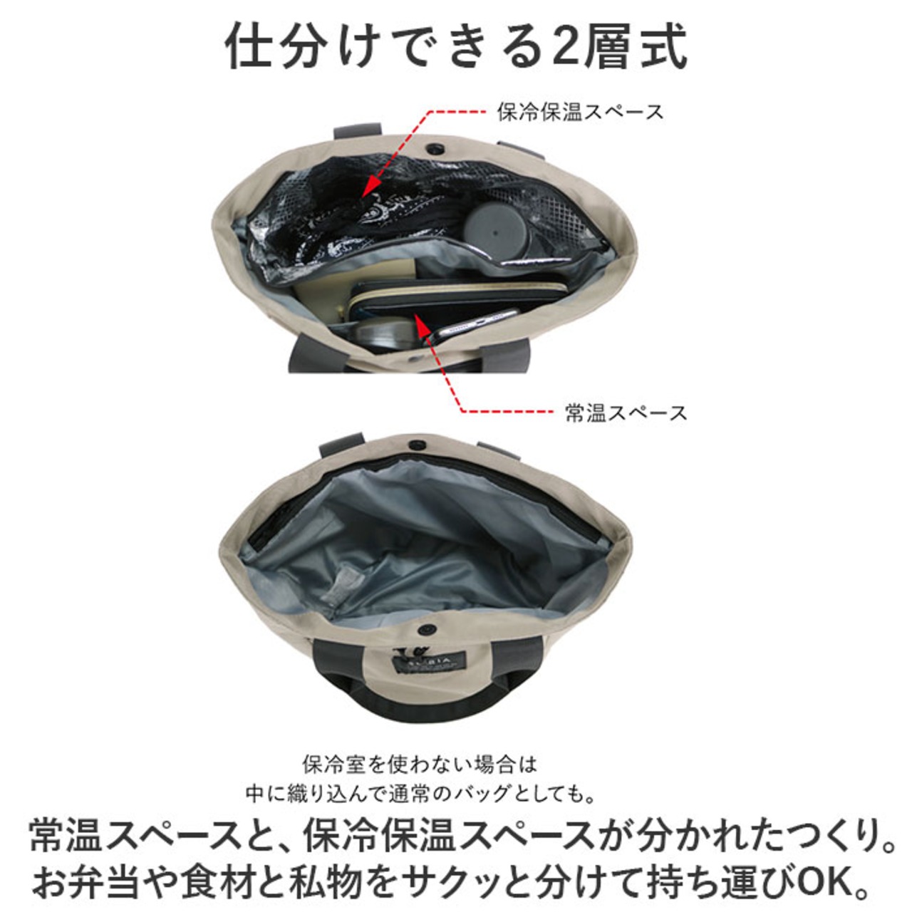 ・常温スペースと、保冷保温スペースが分かれたつくり。お弁当や食材と私物をサクッと分けて持ち運びOK。