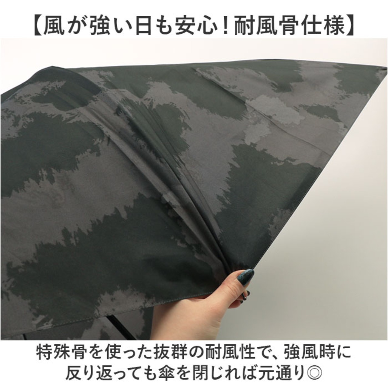 ・特殊骨を使った抜群の耐風性で、強風時に反り返っても傘を閉じれば元通り◎