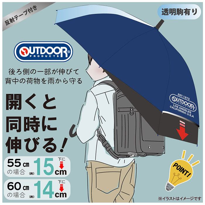 ・傘の一部がぐ~んと伸びて、ランドセルやリュックを濡らさない!大人気ブランド「OUTDOOR PRODUCTS」から、「キッズ用 伸びる長傘」が新登場。