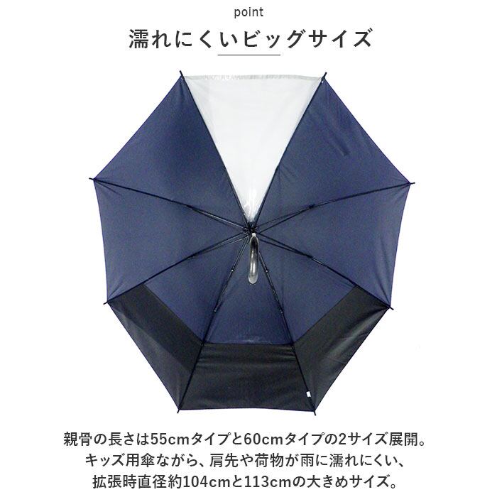 ・親骨の長さは55cmタイプと60cmタイプの2サイズ展開。キッズ用傘ながら、肩先や荷物が雨に濡れにくい、拡張時直径約104cmと113cmの大きめサイズ。