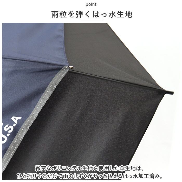 ・緻密なポリエステル生地を使用した傘生地は、ひと振りするだけで雨のしずくがサッと払えるはっ水加工済み。