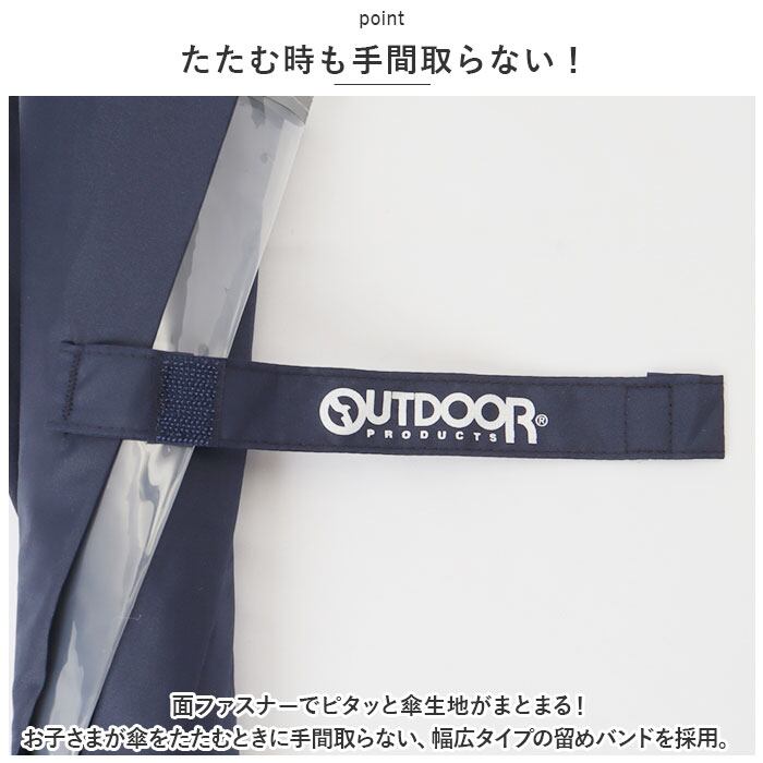 ・面ファスナーでピタッと傘生地がまとまる!お子さまが傘をたたむときに手間取らない、幅広タイプの留めバンドを採用。