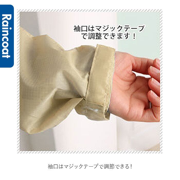 ・レインコートはフロントジップ、裾が長めのデザインで、ボトムスの水濡れもしっかりガード。袖口はマジックテープで調節できる!
