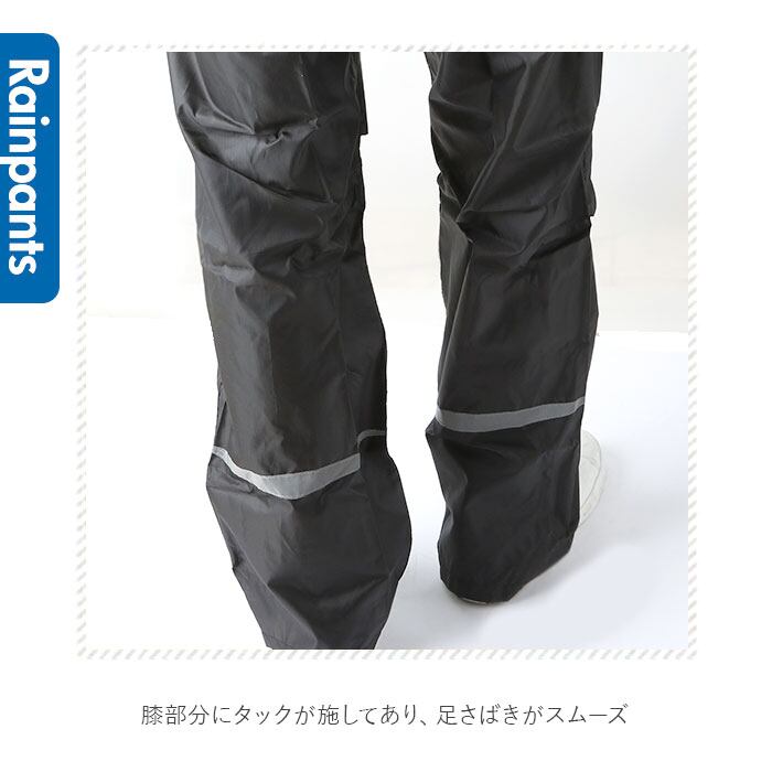 ・ウエストゴム式のレインパンツは脱ぎ着がラクに出来て、通勤・通学用ズボンの上から履いてもつっぱらない余裕のあるつくり。膝部分にタックが施してあり、足さばきスムーズ。