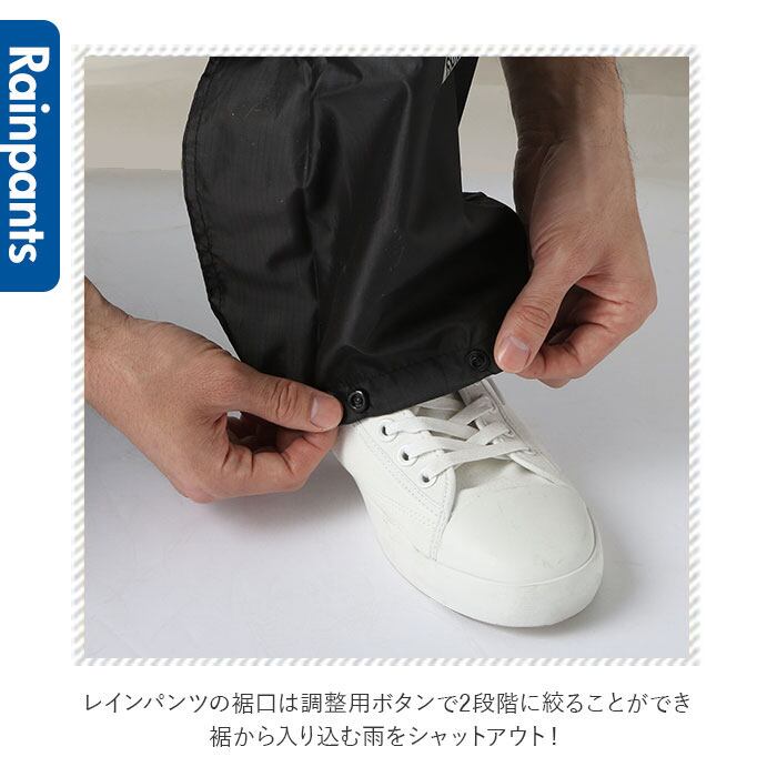 レインパンツの裾口は調整用ボタンで2段階に絞ることができ、裾から入り込む雨をシャットアウト!