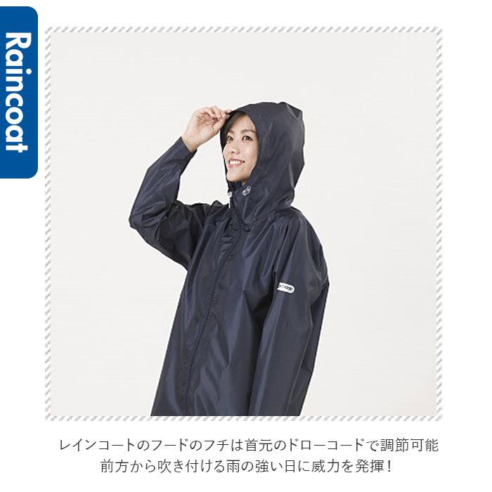 ・レインコートのフードのフチは首元のドローコードで調節可能。前方から吹き付ける雨の強い日に威力を発揮!