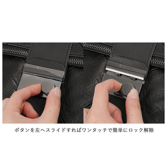・メインの開口部は天ファスナーで開閉し、物が飛び出さないようにベルトの金具でロックが可能。ボタンを左へスライドすればワンタッチで簡単にロック解除ができる。