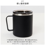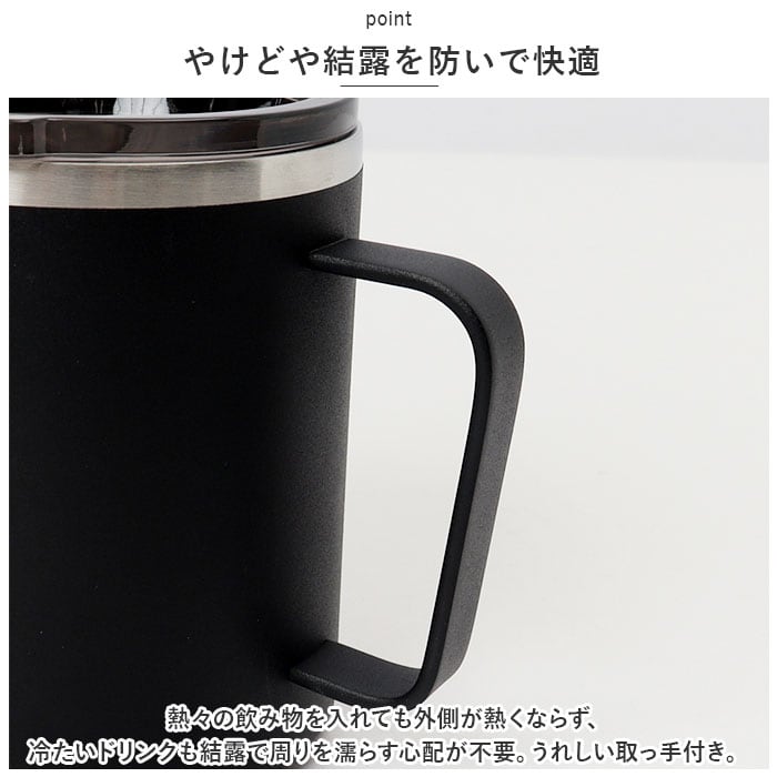 ・熱々の飲み物を入れても外側が熱くならず、冷たいドリンクも結露で周りを濡らす心配が不要。うれしい取っ手付き。