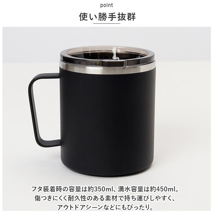 ・フタ装着時の容量は約350ml、満水容量は約450ml。傷つきにくく耐久性のある素材で持ち運びしやすく、アウトドアシーンなどにもぴったり。