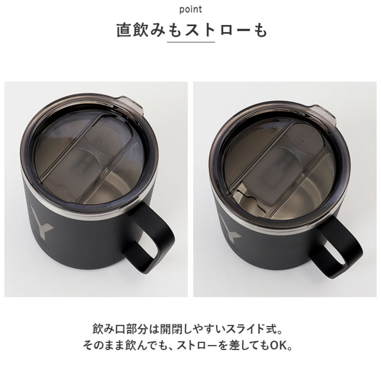 ・飲み口部分は開閉しやすいスライド式。そのまま飲んでも、ストローを差してもOK。