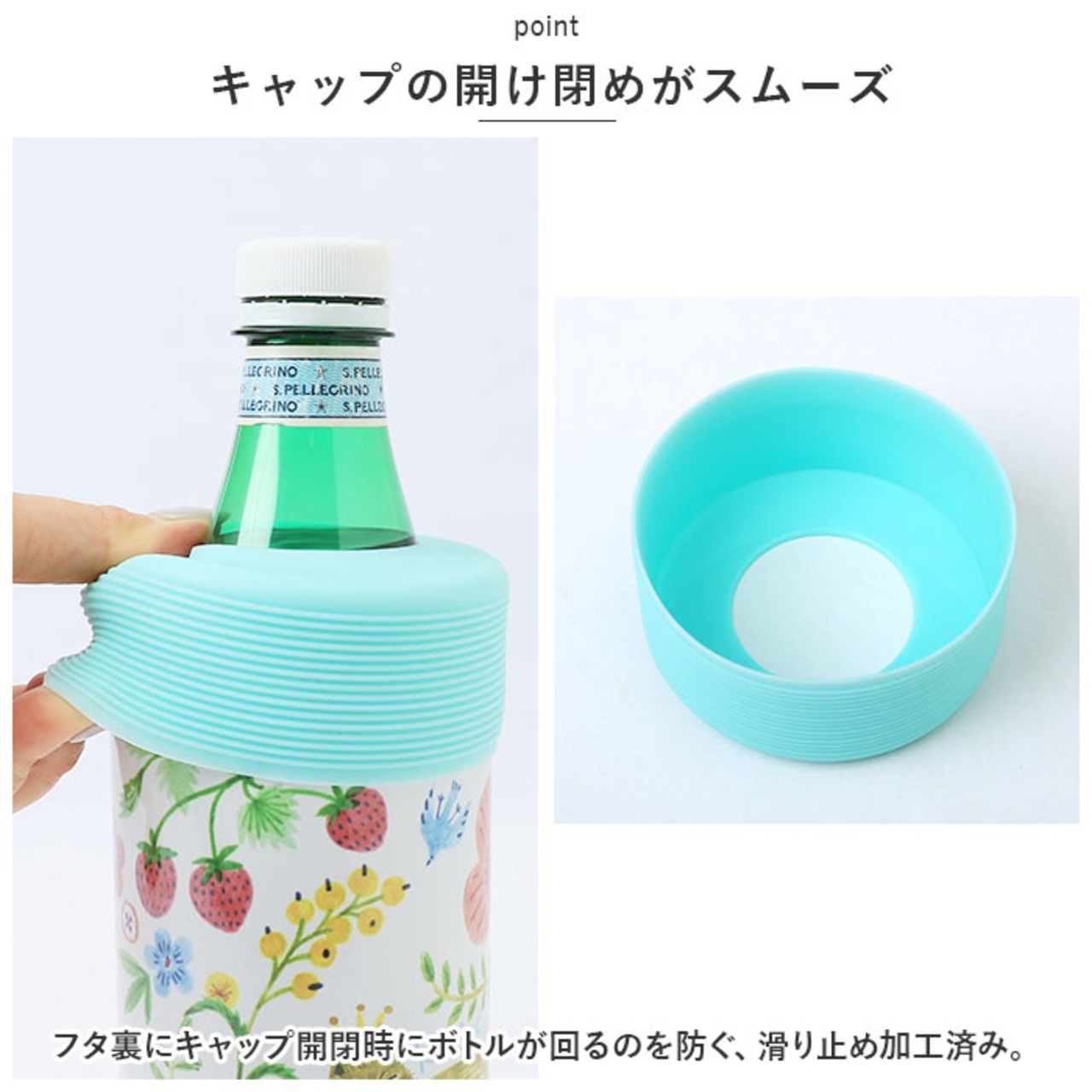 ・フタ裏にキャップ開閉時にボトルが回るのを防ぐ、滑り止め加工済み。