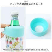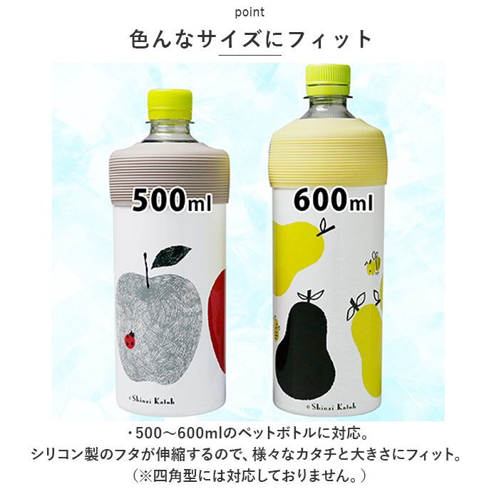 ・500~600mlのペットボトルに対応。シリコン製のフタが伸縮するので、様々なカタチと大きさにフィット。(※四角型には対応しておりません。)