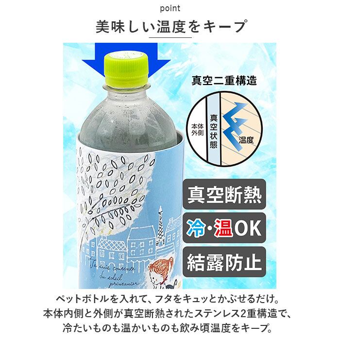 ・ペットボトルを入れて、フタをキュッとかぶせるだけ。本体内側と外側が真空断熱されたステンレス2重構造で、冷たいものも温かいものも飲み頃温度をキープ。