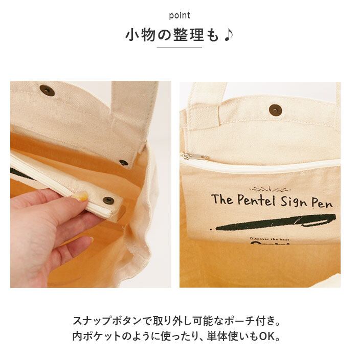 ・スナップボタンで取り外し可能なポーチ付き。内ポケットのように使ったり、単体使いもOK。