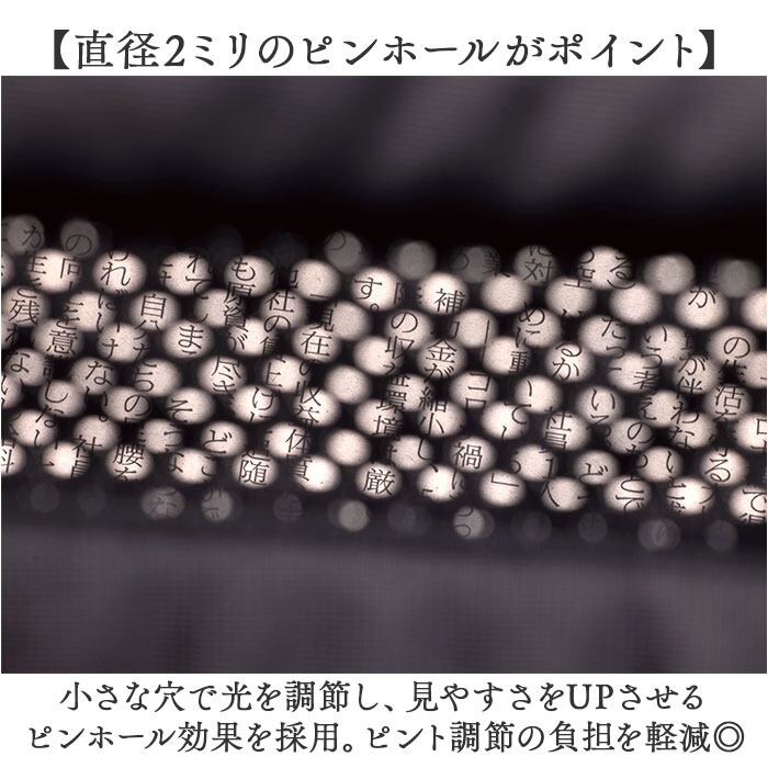 ・小さな穴で光を調節し、見やすさをUPさせるピンホール効果を採用。ピント調節の負担を軽減◎