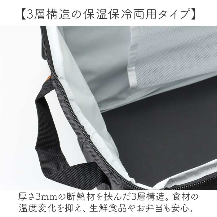 ・厚さ3mmの断熱材を挟んだ3層構造。食材の温度変化を抑え、生鮮食品やお弁当も安心。
