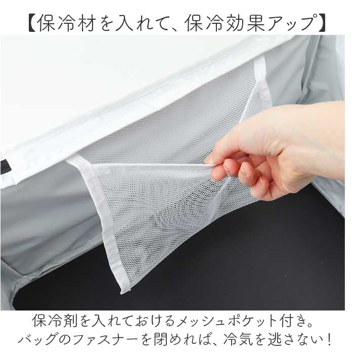 ・保冷剤を入れておけるメッシュポケット付き。バッグのファスナーを閉めれば、冷気を逃さない!