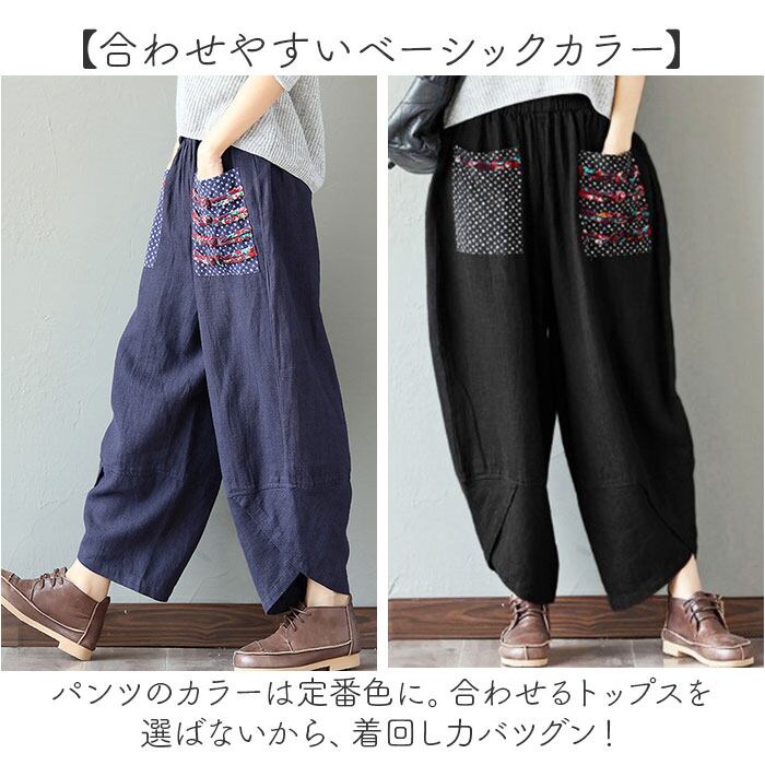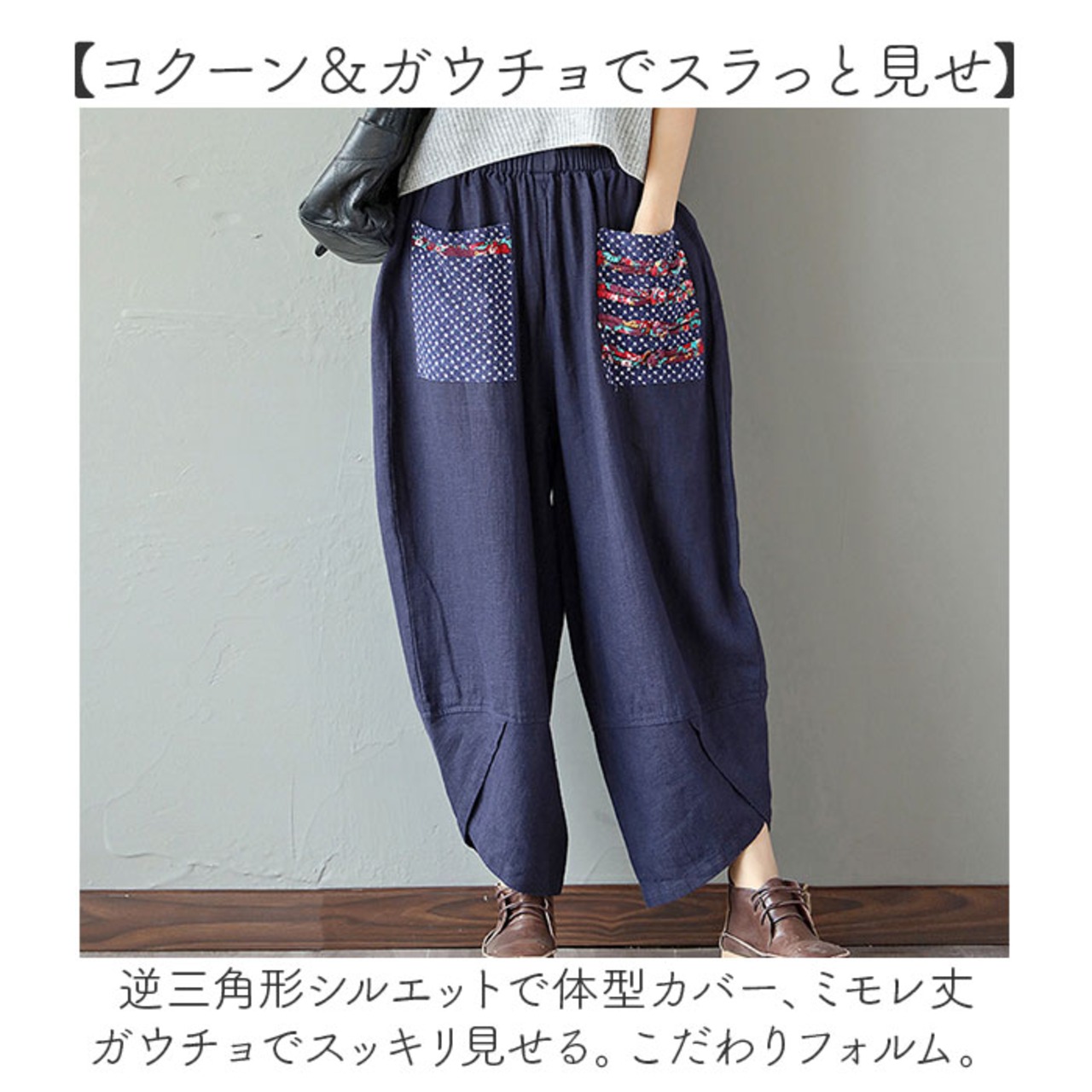 ・逆三角形シルエットで体型カバー、ミモレ丈ガウチョでスッキリ見せる。こだわりフォルム。