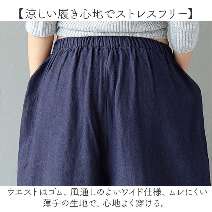 ・ウエストはゴム、風通しのよいワイド仕様、ムレにくい薄手の生地で、心地よく穿ける。
