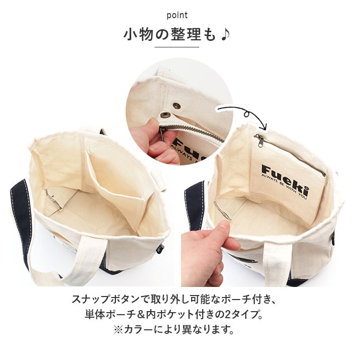 ・スナップボタンで取り外し可能なポーチ付き、単体ポーチ&内ポケット付きの2タイプ。(※カラーにより異なります。)