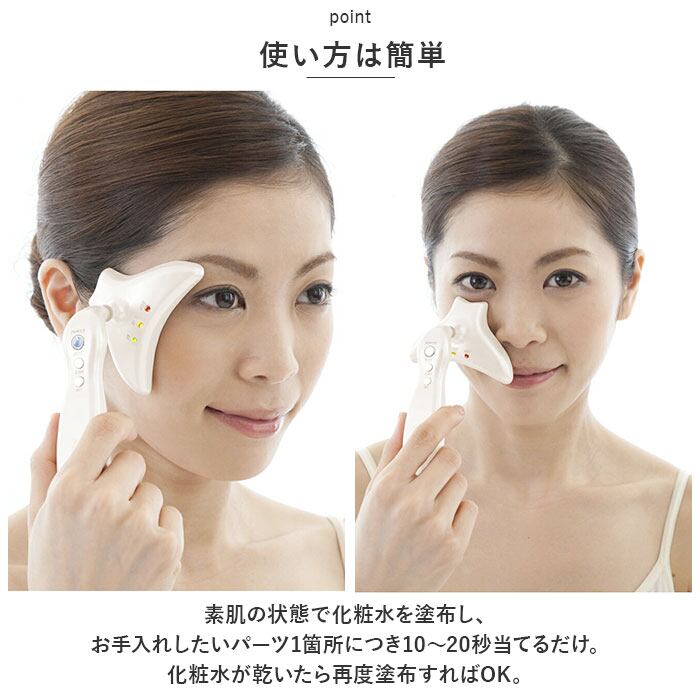 ・素肌の状態で化粧水を塗布し、お手入れしたいパーツ1箇所につき10~20秒当てるだけ。化粧水が乾いたら再度塗布すればOK。