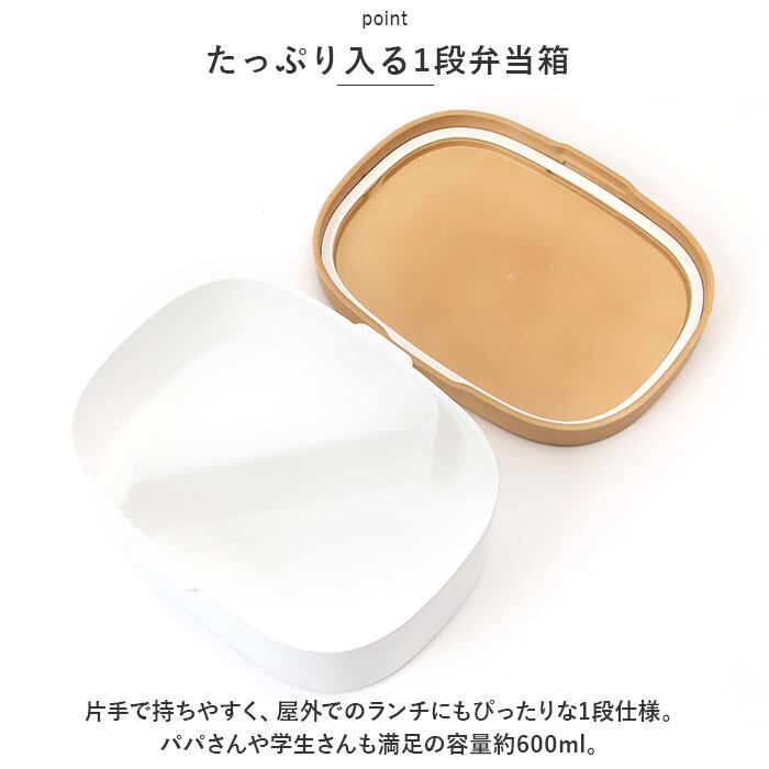 ・片手で持ちやすく、屋外でのランチにもぴったりな1段仕様。パパさんや学生さんも満足の容量約600ml。