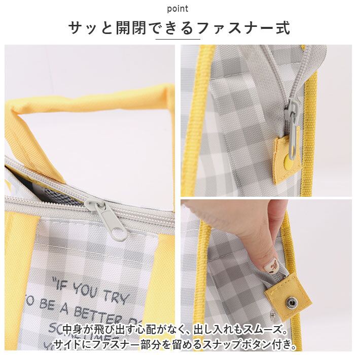 ・中身が飛び出す心配がなく、出し入れもスムーズ。サイドにファスナー部分を留めるスナップボタン付き。