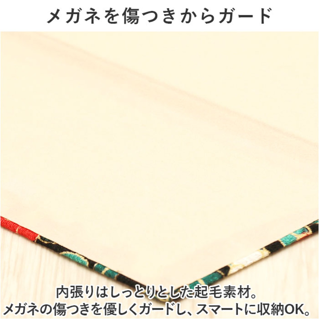 ・内張りはしっとりとした起毛素材。メガネの傷つきを優しくガードし、スマートに収納OK。