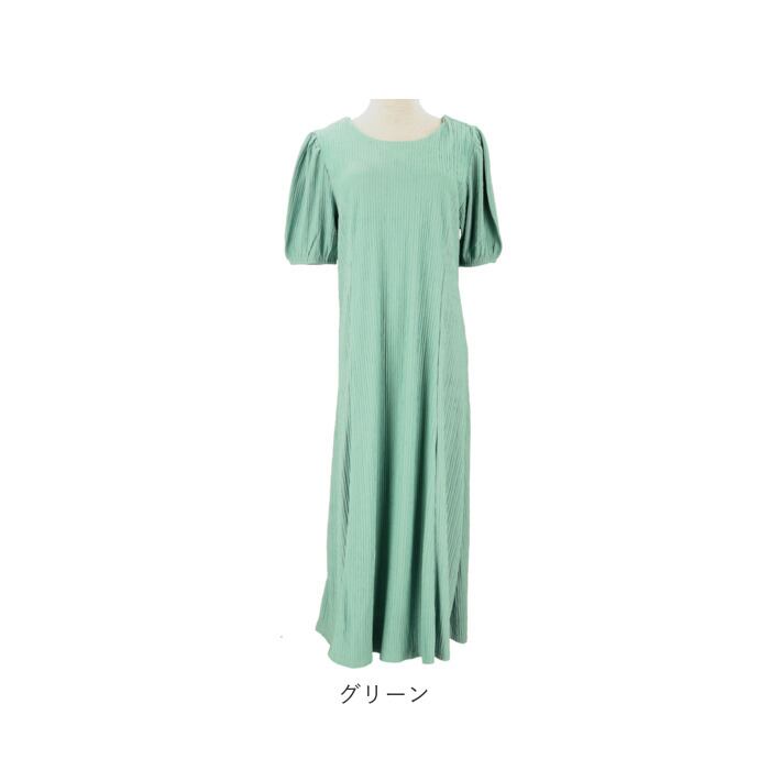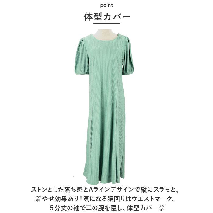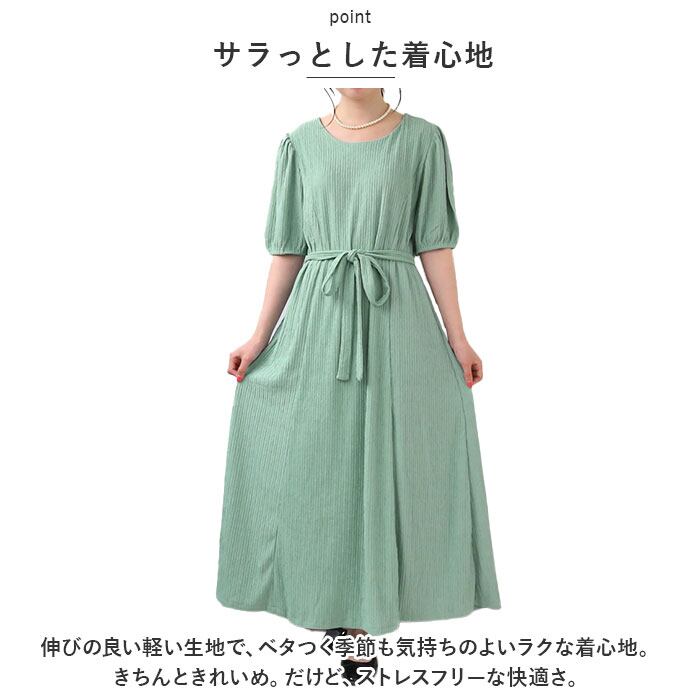 ワンピース 半袖 ロング 通販 ロングワンピース ロング丈 マキシ丈 フレア Aライン 5分袖 リップル生地 ウエストリボン ぽわん袖 ボリューム袖 外出 お出かけ 通勤 通学 春 夏 無地 シンプル フェミニン ワンピ レディース