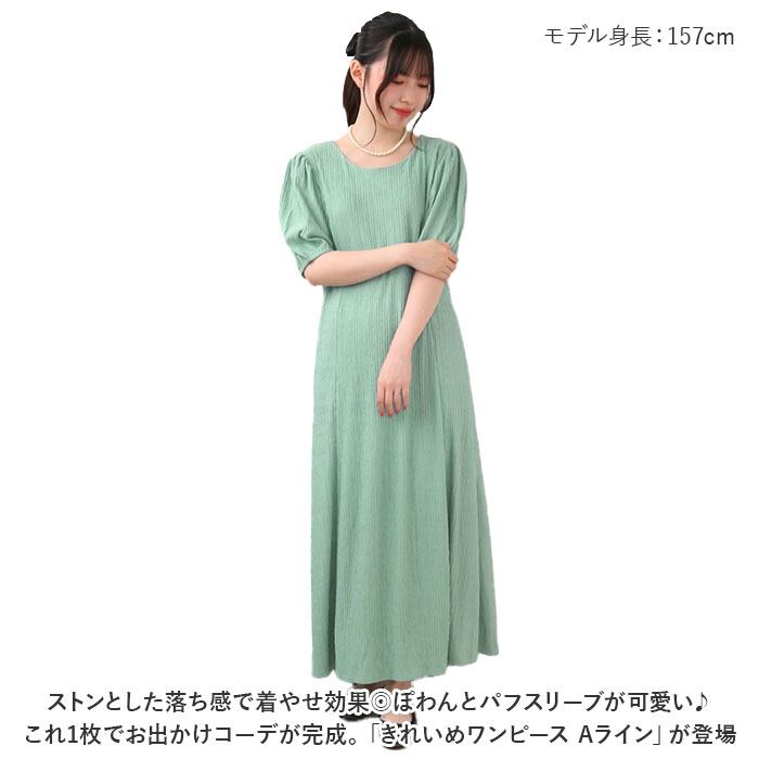 ・ストンとした落ち感で着やせ効果◎ぽわんとパフスリーブが可愛い♪これ1枚でお出かけコーデが完成。「きれいめワンピース Aライン」が登場。