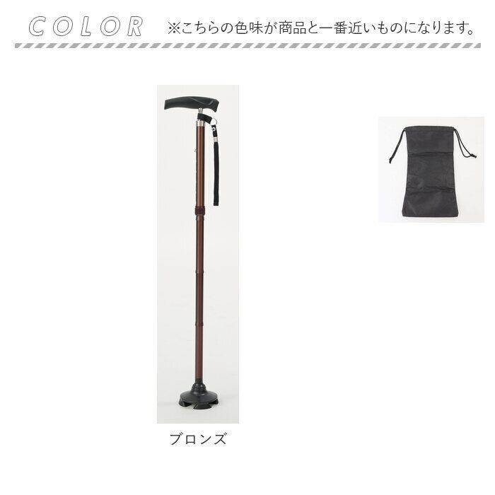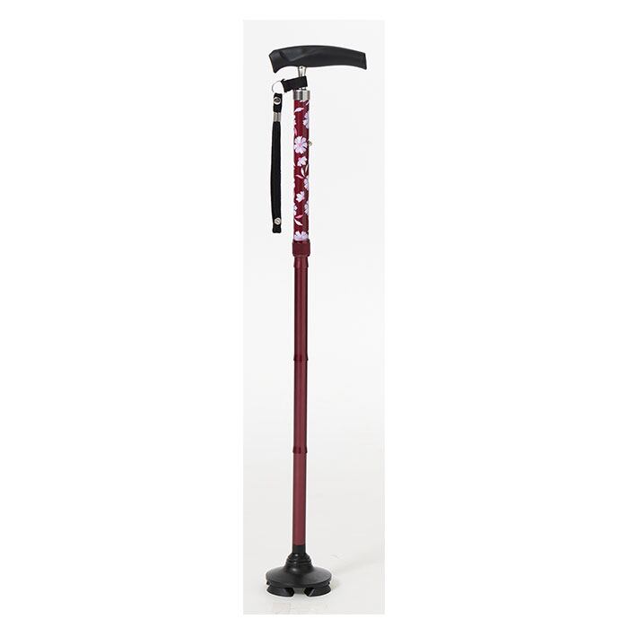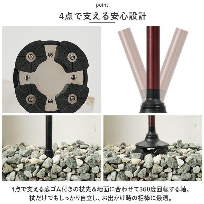 ・4点で支える底ゴム付きの杖先&地面に合わせて360度回転する軸。杖だけでもしっかり自立し、お出かけ時の相棒に最適。
