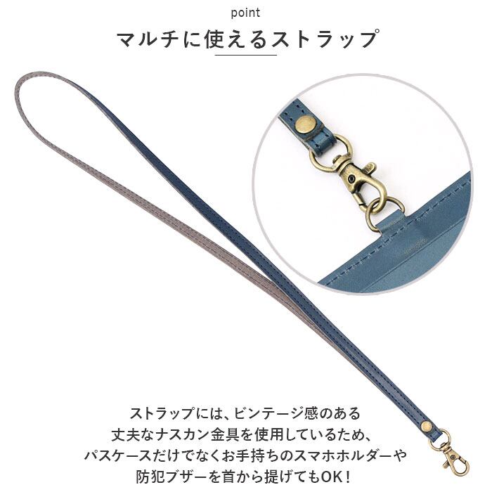 ・ストラップには、ビンテージ感のある丈夫なナスカン金具を使用しているため、パスケースだけでなくお手持ちのスマホホルダーや防犯ブザーを首から提げてもOK!