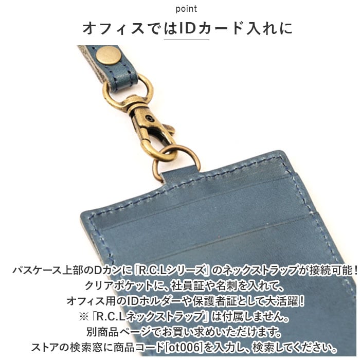 ・パスケース上部のDカンに「R.C.Lシリーズ」のネックストラップが接続可能!クリアポケットに、社員証や名刺を入れて、オフィス用のIDホルダーや保護者証として大活躍!(※「R.C.Lネックストラップ」は付属しません。別商品ページでお買い求めいただけます。ストアの検索窓に商品コード[ot006]を入力し、検索してください。)