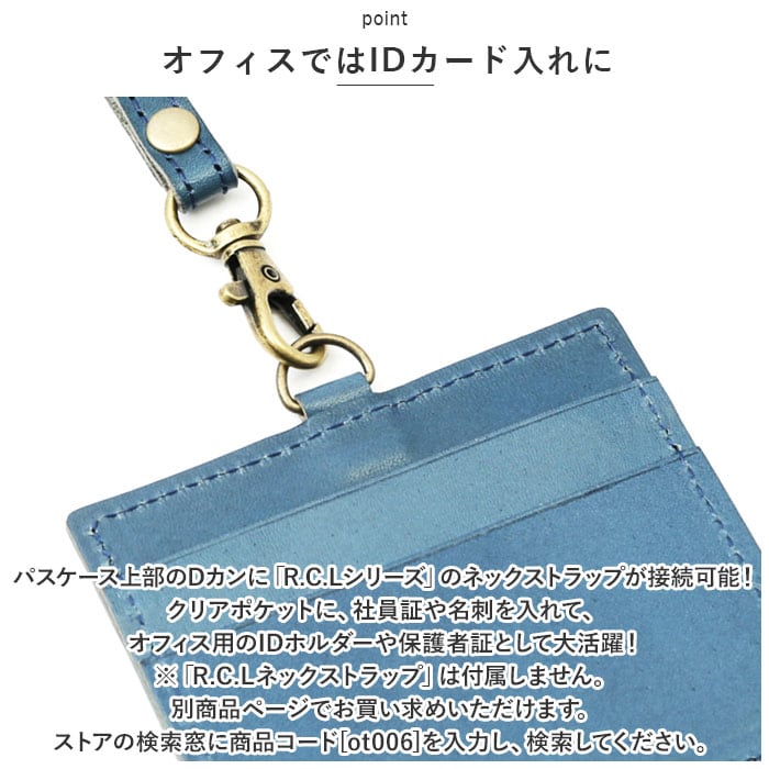 ・パスケース上部のDカンに「R.C.Lシリーズ」のネックストラップが接続可能!クリアポケットに、社員証や名刺を入れて、オフィス用のIDホルダーや保護者証として大活躍!(※「R.C.Lネックストラップ」は付属しません。別商品ページでお買い求めいただけます。ストアの検索窓に商品コード[ot006]を入力し、検索してください。)