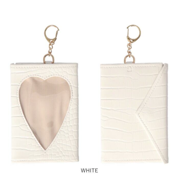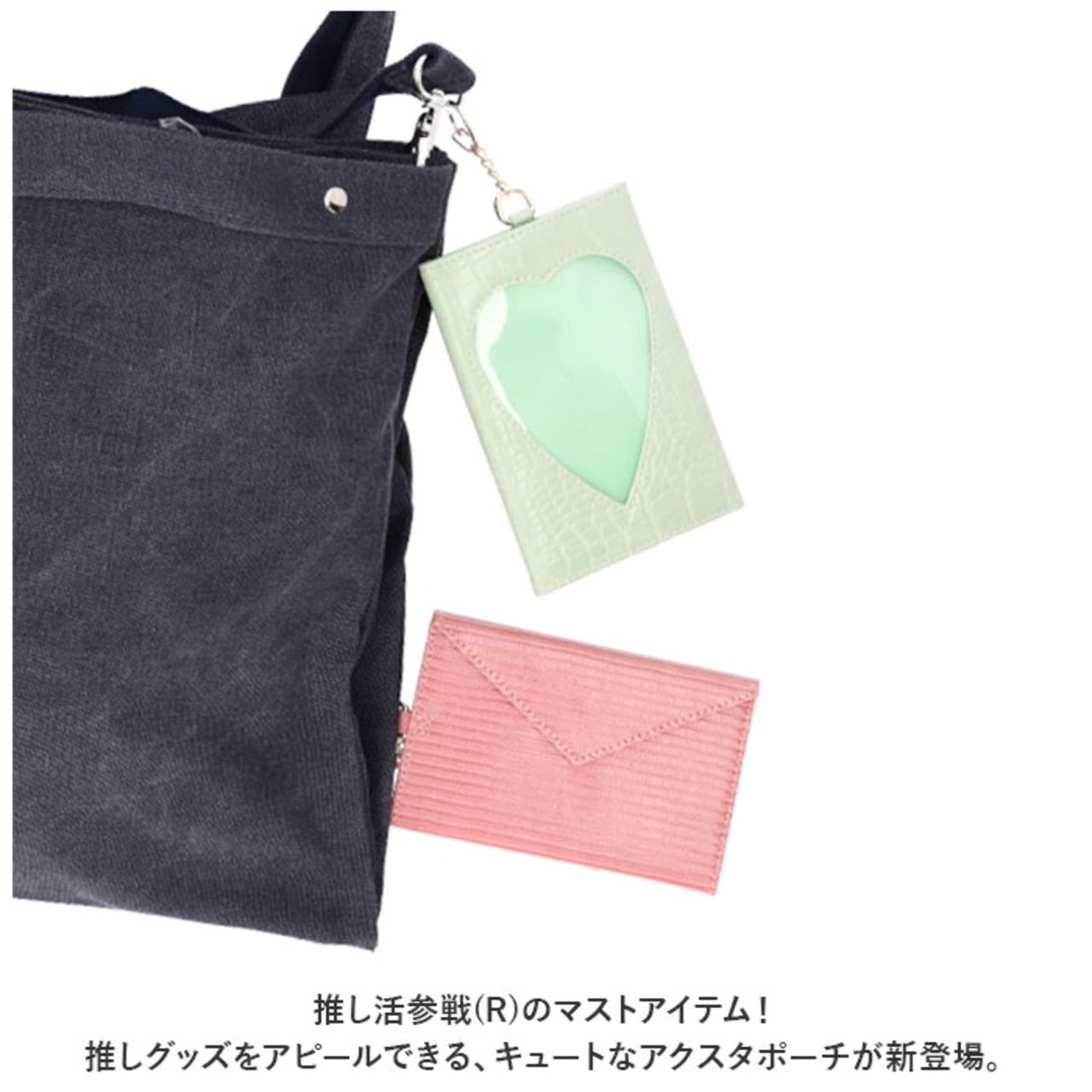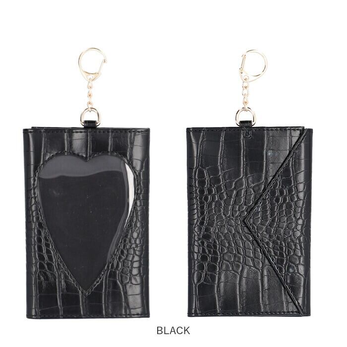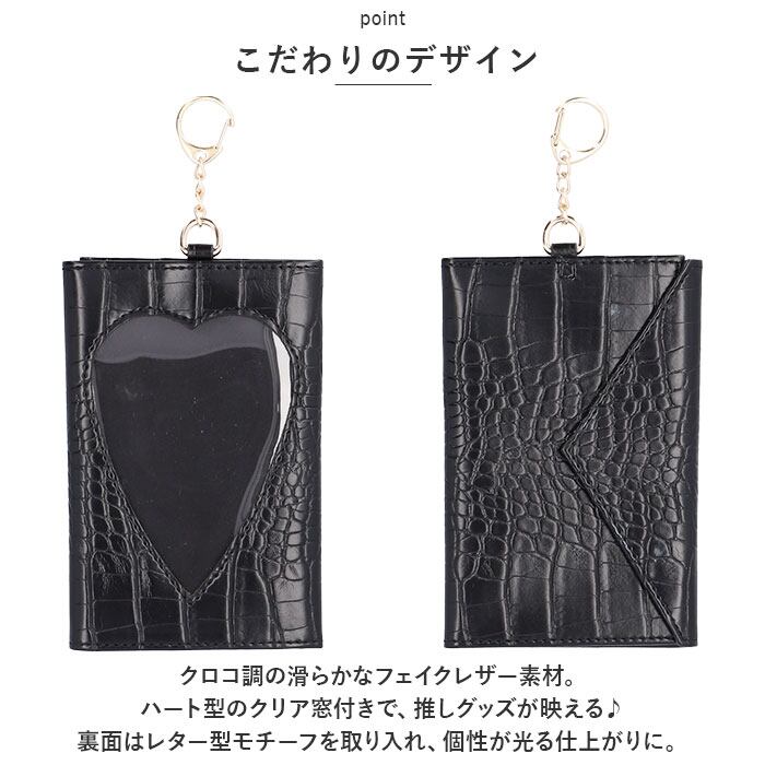 ・クロコ調の滑らかなフェイクレザー素材。ハート型のクリア窓付きで、推しグッズが映える♪裏面はレター型モチーフを取り入れ、個性が光る仕上がりに。