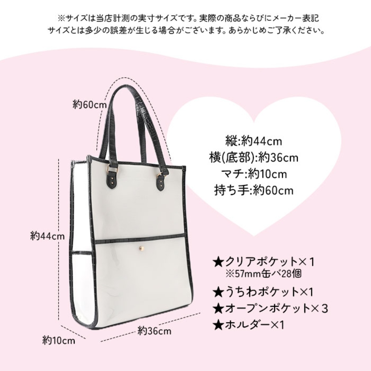 ・外側のクリアポケットに、アクスタや缶バッジ、ミニぬいぐるみなどをIN☆推しグッズを自分仕様にデコレーション♪(※57mmの缶バッジが28個入るサイズ感です。)