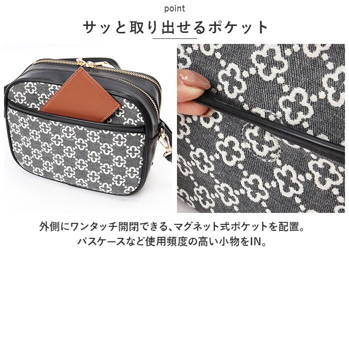 ・外側にワンタッチ開閉できる、マグネット式ポケットを配置。パスケースなど使用頻度の高い小物をIN。