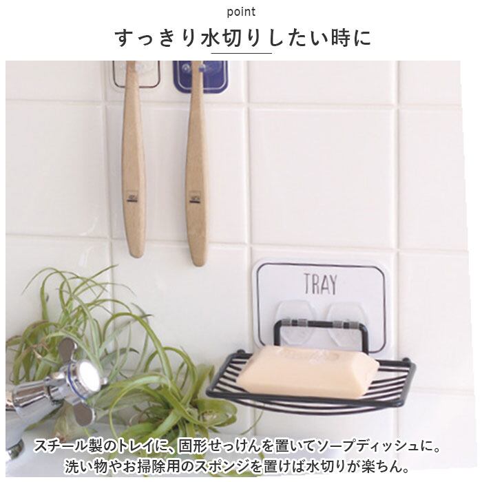 ・スチール製のトレイに、固形せっけんを置いてソープディッシュに。洗い物やお掃除用のスポンジを置けば水切りが楽ちん。