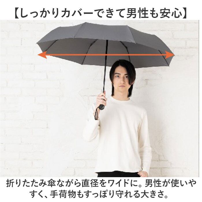 ・折りたたみ傘ながら直径をワイドに。男性が使いやすく、手荷物もすっぽり守れる大きさ。