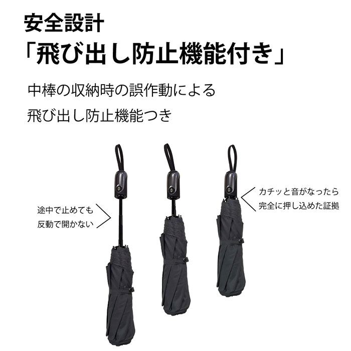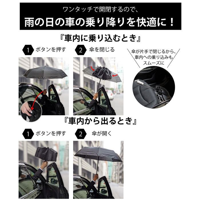 ・手元のボタンを押すだけで自動開閉!車内への乗り込みも快適&中棒の飛び出し防止機能付き。