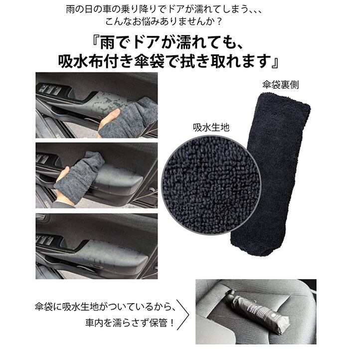 ・収納袋の内側は吸水生地仕上げ。雨で車のドアが濡れてもサッと拭き取り、車内を濡らさない!